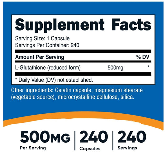 Cápsulas de glutatión Nutricost 500 mg, 240 cápsulas - Sin gluten ni OMG